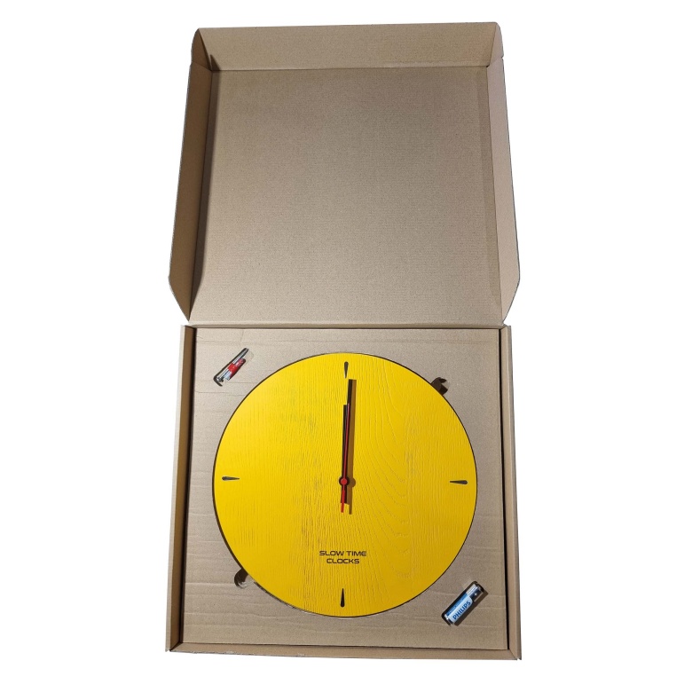 Zegar ścienny z wahadłem Slow Time Clocks wykonany jest ręcznie z klejonego drewna jesionowego klasy I. W zestawie znajduje się wahadło wykonane z tego samego surowca. Zegar oraz wahadło pomalowane na kolor żółty. Produkt prezentuje nowoczesny i minimalistystyczny styl rękodzieła.